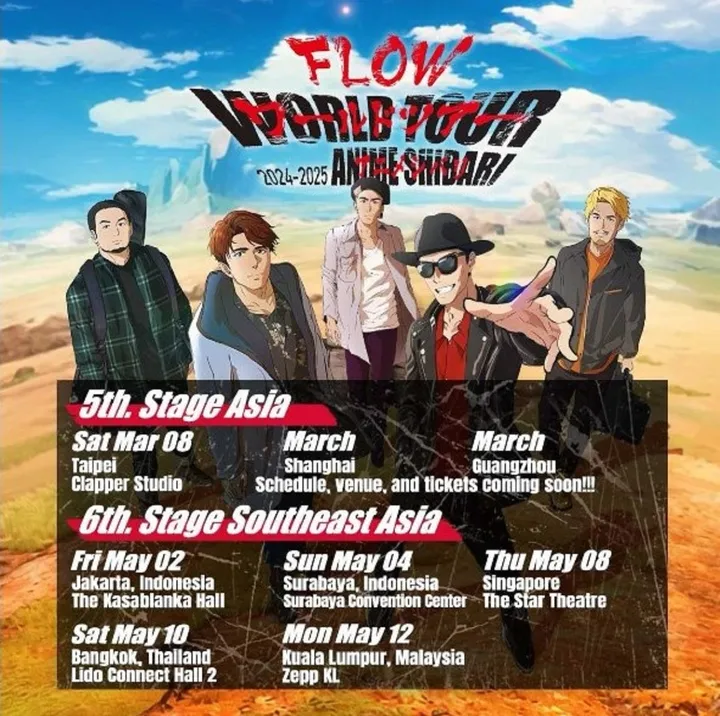 FLOW datang dalam rangkaian tur “Anime Shibari”—konsep super unik yang nge-blend konser musik dengan sentuhan teatrikal ala anime. Gak main-main, suasana konser bakal dibangun kayak lo lagi masuk dunia anime beneran. Suara karakter, efek panggung, dan lagu-lagu yang udah nemenin masa kecil kita… lengkap, bro!