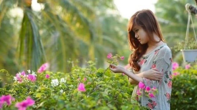 Bunga keliatan tinggi, model kayak ratu bunga di dunia sendiri.