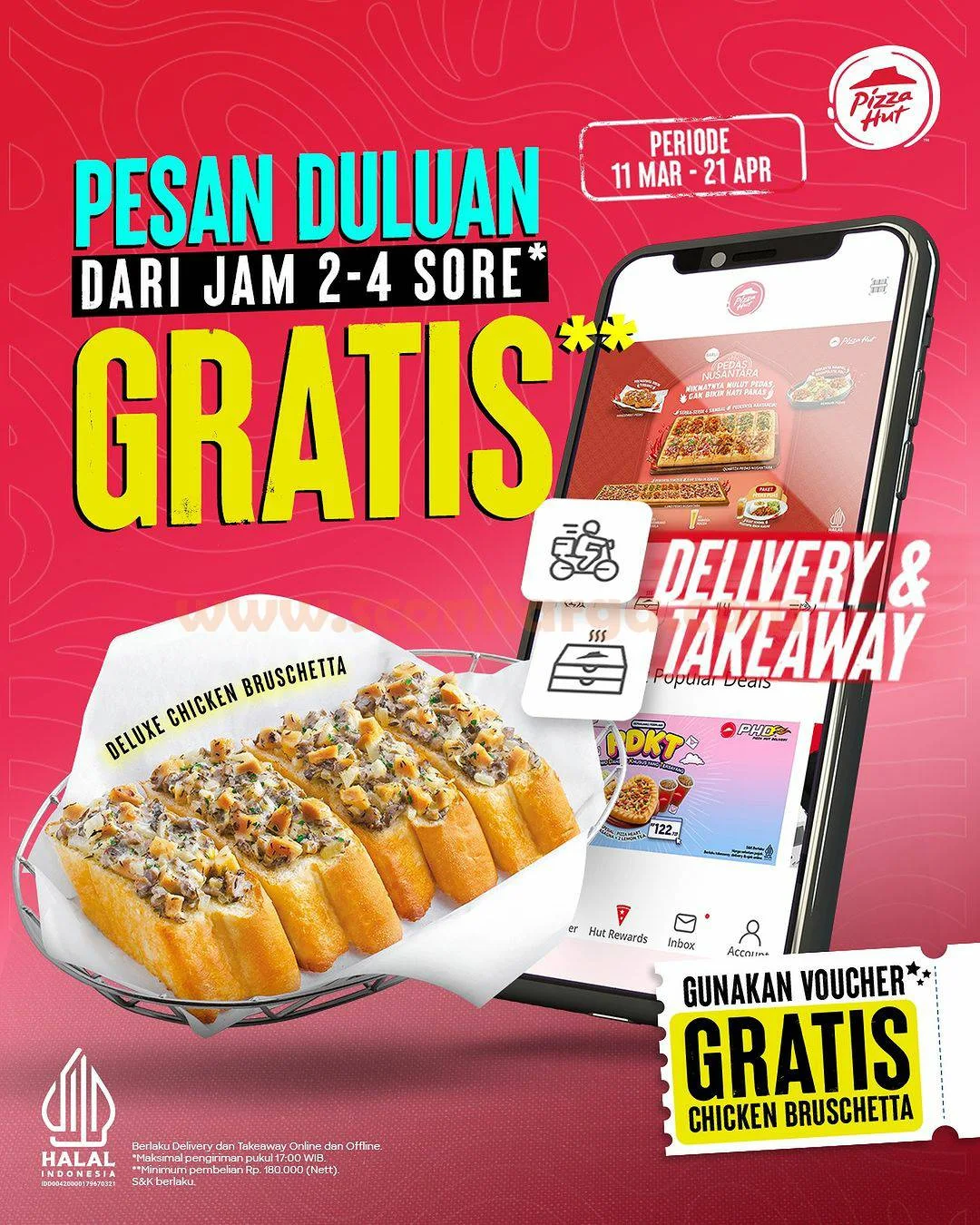 Khusus dari tanggal 11 Maret sampe 21 April, pesen via takeaway atau delivery di website pizzahut.co.id atau aplikasi, Promo Pizza Hut Indonesia jam 2-4 sore dengan belanja minimal Rp180 ribu nett, bisa dapet GRATIS Chicken Bruschetta!