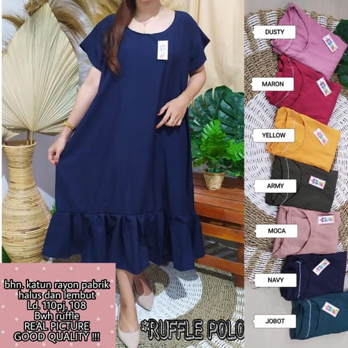Pilihan motif ceria dipadankan dengan bentuk ruffle yang bergelombang menunjukkan kesan daster yang tidak monoton. Nah, daster kekinian yang satu ini layak Anda jadikan koleksi di rumah. Pilihan variannya banyak karena model ruffle yang bisa dipasangkan dibagian tangan, bagian bawah atau bagian kerah, bahkan model bentuk ruffle dan warnanya sangat bervariasi.
