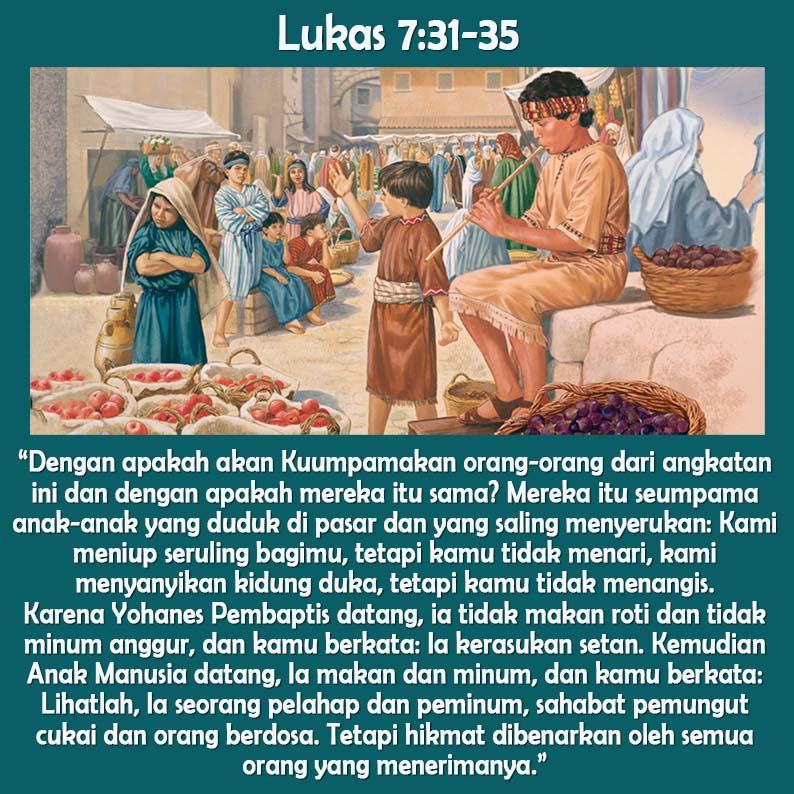 Sekali peristiwa berkatalah Yesus kepada orang banyak, “Dengan apakah akan Kuumpamakan orang-orang dari angkatan ini? Mereka sama dengan anak-anak yang duduk di pasar dan berseru-seru, ‘Kami meniup seruling bagimu, tetapi kalian tidak menari. Kami menyanyikan kidung duka, tetapi kalian tidak menangis.’