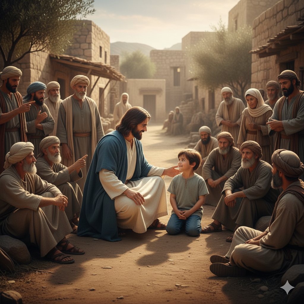 Sekali peristiwa datanglah murid-murid kepada Yesus dan bertanya, “Siapakah yang terbesar dalam Kerajaan Surga?” maka Yesus memanggil seorang anak kecil dan menempatkannya di tengah-tengah mereka, lalu berkata, “Aku berkata kepadamu: