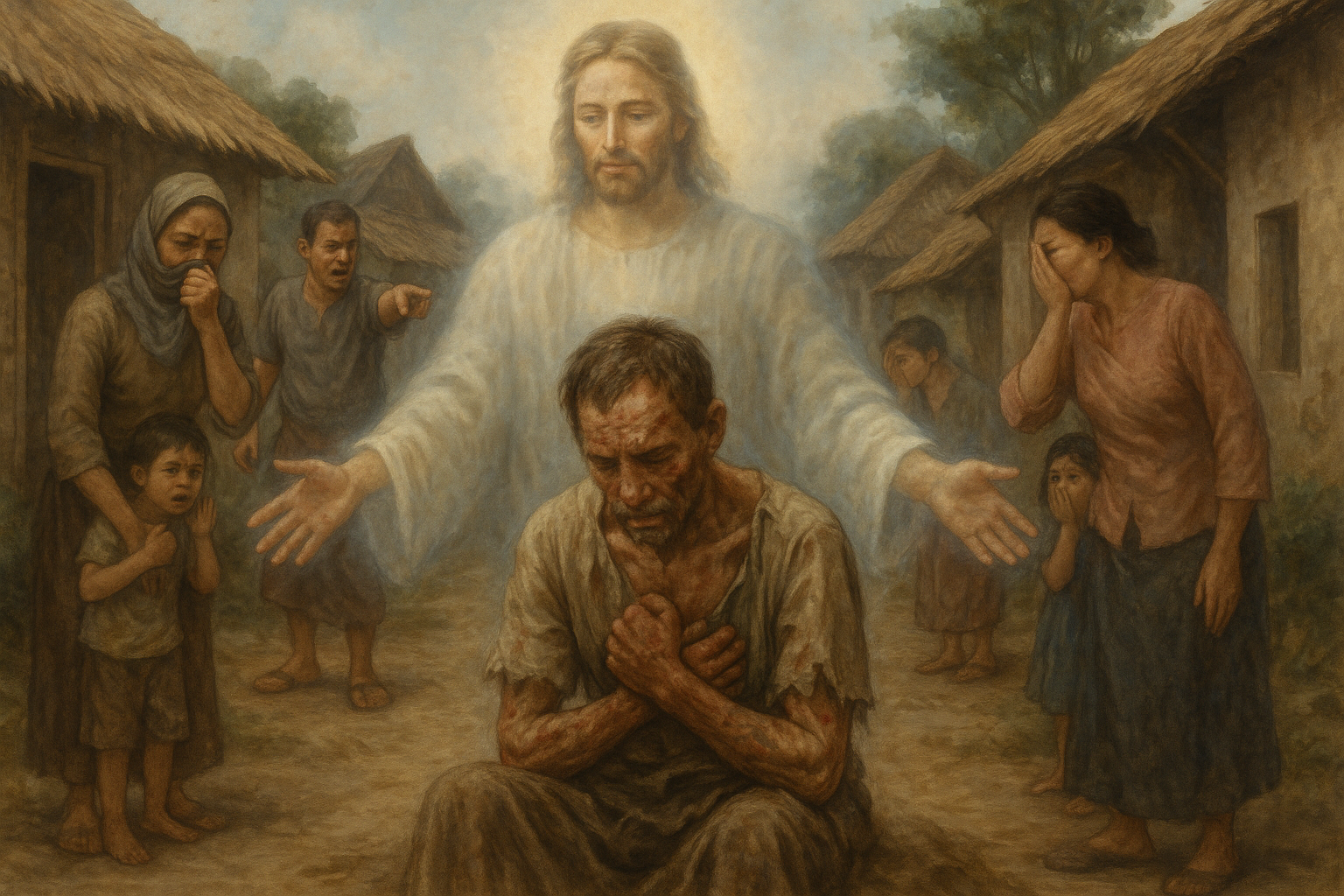 Dalam perjalanan-Nya ke Yerusalem, Yesus menyusuri perbatasan Samaria dan Galilea. Ketika Ia masuk suatu desa, datanglah sepuluh orang kusta menemui Dia. Mereka tinggal berdiri agak jauh, dan berteriak, “Yesus, Guru, kasihanilah kami!” Yesus lalu memandang mereka dan berkata, “Pergilah dan perlihatkanlah dirimu kepada imam-imam.”