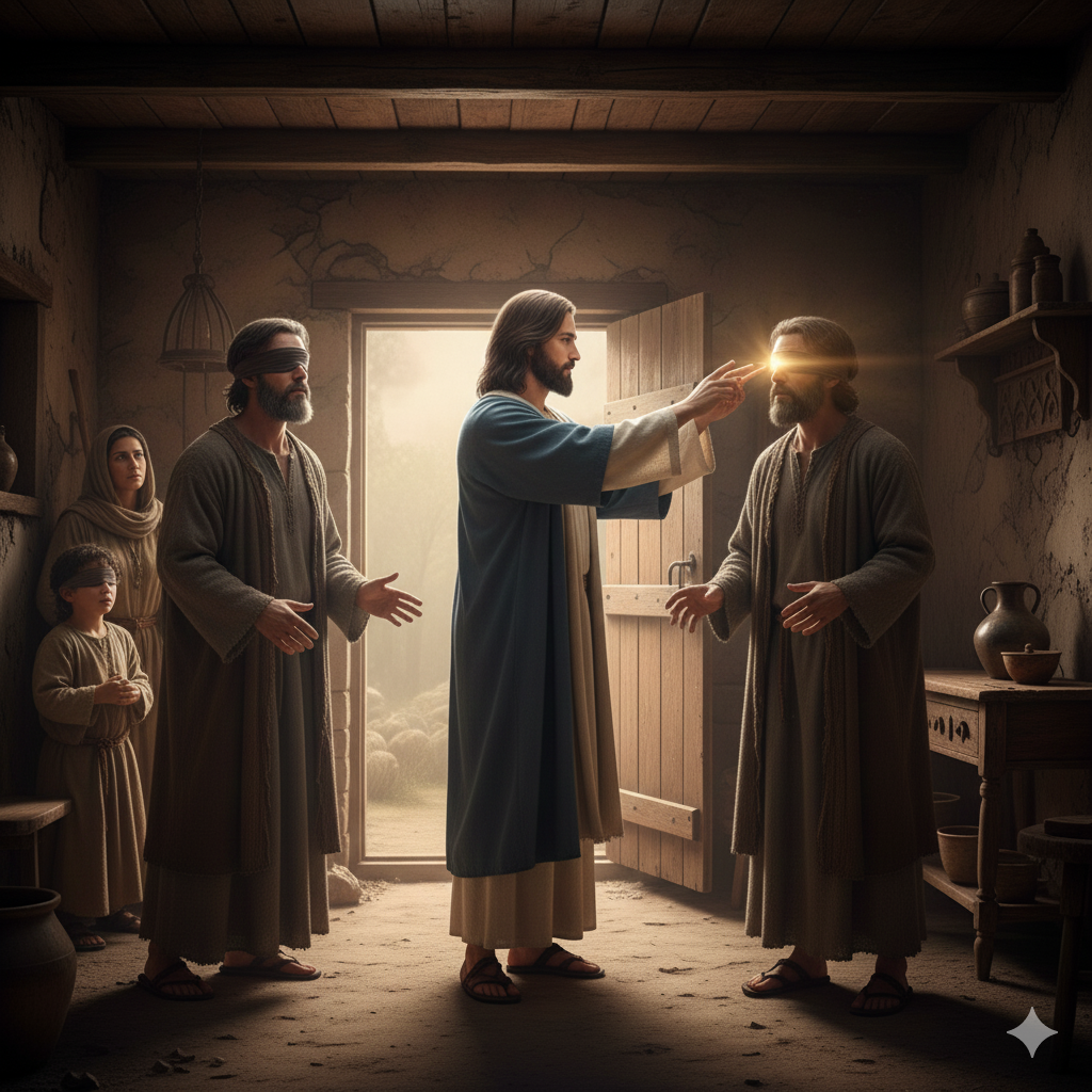 Sekali peristiwa ada dua orang buta mengikuti Yesus sambil berseru-seru, “Kasihanilah kami, hai Anak Daud!” Setelah Yesus masuk ke dalam sebuah rumah, datanglah kedua orang buta itu kepada-Nya.