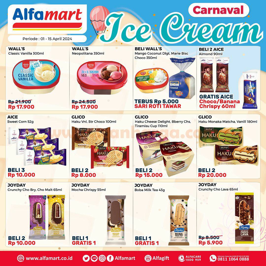 Promo Alfamart Ice Cream Fair (Festival Carnaval Es Krim) berlangsung dari tanggal 5 hingga 15 April 2024, jadi jangan sampai ketinggalan ya.