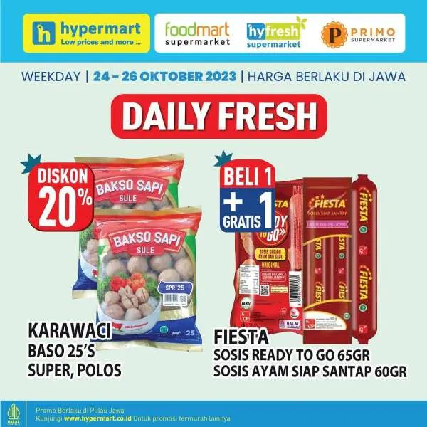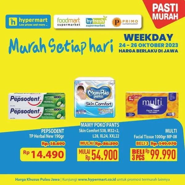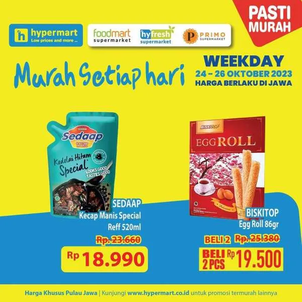 Dari tanggal 24 sampe 26 Oktober 2023 nanti, Hypermart bakal ada promo Hyper Diskon Weekday yang bikin belanja jadi lebih hemat. Kita bisa dapetin diskon yang lumayan banget buat beli macem-macem, mulai dari makanan dan minuman, peralatan dapur, barang-barang perawatan diri, sampe yang khusus buat si kecil.