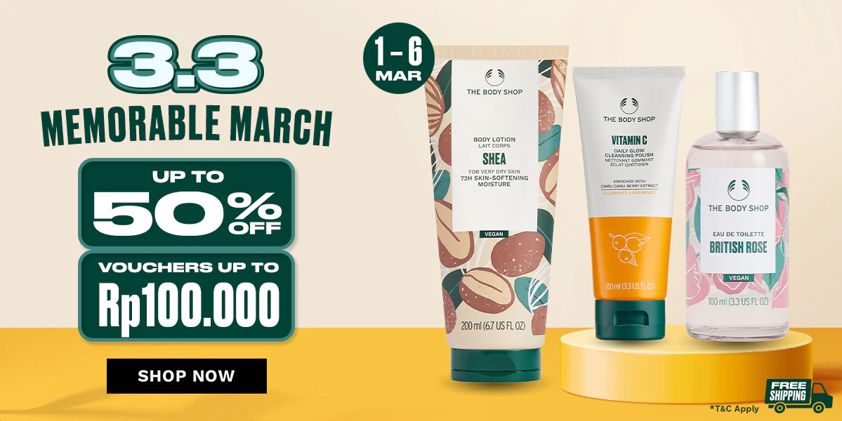 Buat lo yang doyan skincare-an atau sekadar pengen wangi-wangian seharian, ada kabar super kece dari The Body Shop! Dalam rangka 3.3 Memorable March, mereka ngasih diskon GILA-GILAAN sampe 50%! Gak nanggung-nanggung, promo ini berlaku dari tanggal 1 – 6 Maret 2025. Jadi, siap-siap checkout barang-barang wishlist lo, ya!