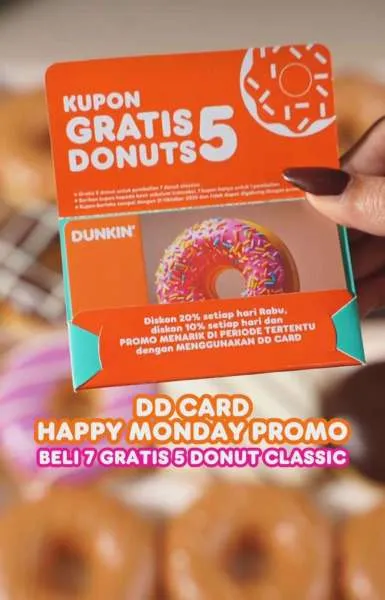 Cuma dengan DD Card, kamu bisa dapetin Beli 7 Gratis 5 Donut Classic. Gila gak tuh, beli segitu dapet bonus segambreng!