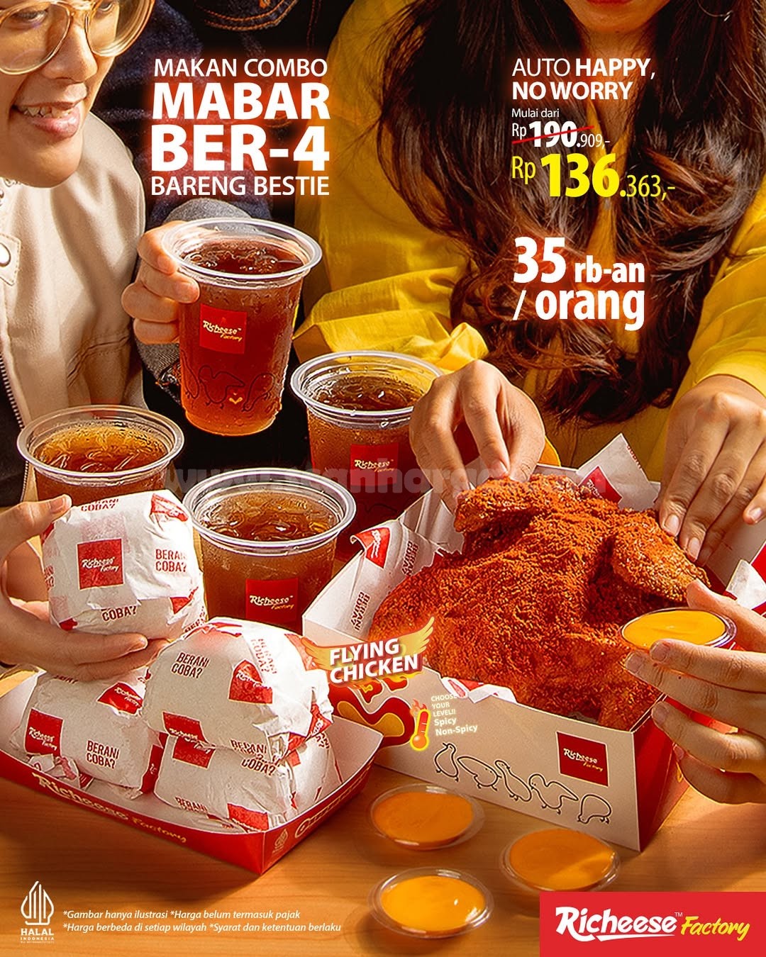 Richeese lagi ngadain promo gokil banget yang namanya Combo Mabar Ber-4 — cocok buat lo yang doyan makan ramean. Cuma mulai dari Rp136.363 doang, lo dan 3 temen bisa nikmatin: