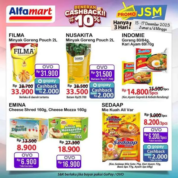 Mau tau lebih detil? Cek langsung di Instagram Alfamart (@alfamart). Ada info promo JSM Alfamart terbaru nih, cashback 10% buat periode 15-17 Desember 2023.