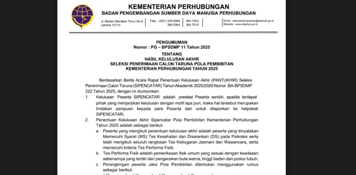 Pengumuman ini keluar lewat Nomor: PG – BPSDMP 11 Tahun 2025, dan isinya: siapa aja yang berhasil nembus tahap akhir dan resmi jadi calon taruna di kampus kece di bawah Kemenhub.