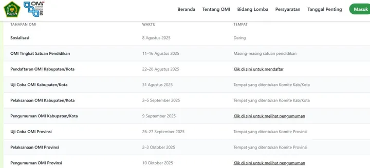 - OMI Tingkat Madrasah: 11โ16 Agustus 2025
