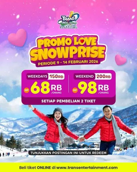 Pas banget nih, Trans Snow World Surabaya lagi ngeluarin promo spesial bertajuk Love Snowprise yang bikin liburan berdua jadi lebih hemat, lebih seru, dan pastinya lebih estetik.